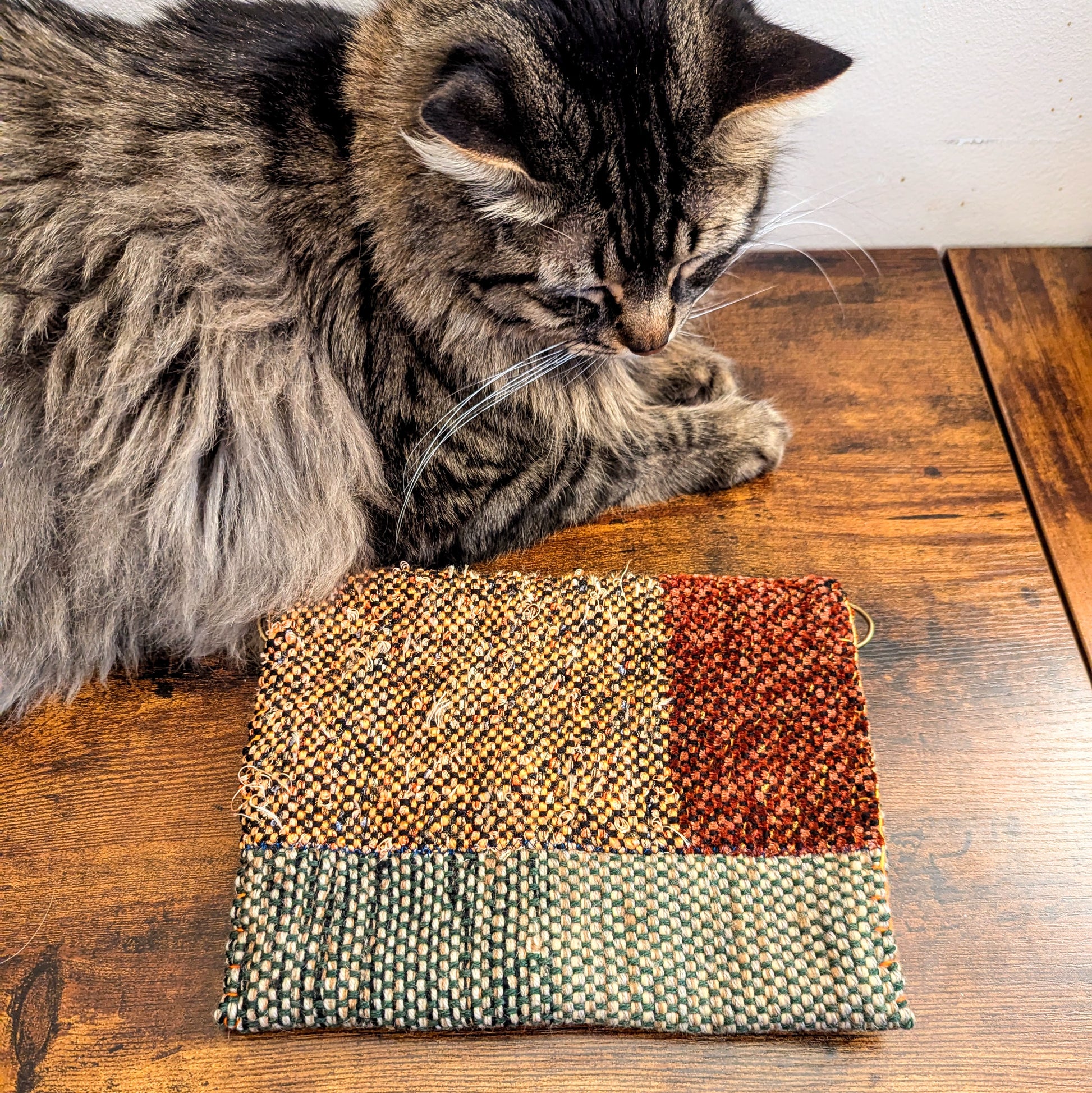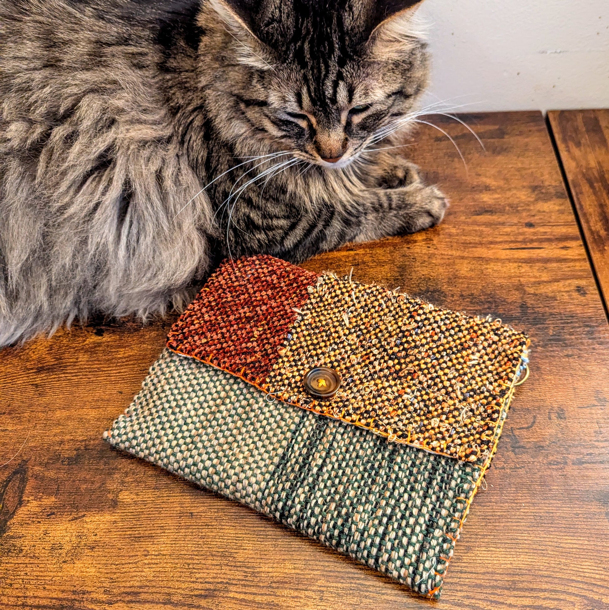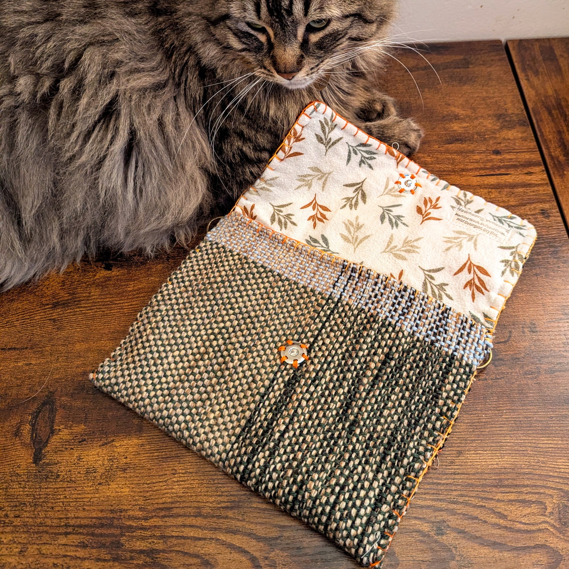 Inspired by the fire that wells from deep in the earth, a handwoven wool and chenille exterior, fern printed flannel interior, wooden button and metal snap will keep your e-reader safe and secure as you relax into pleasant reading. Or if you don't have an e-reader the rings on the side offer up adaptability as a clutch or handbag!