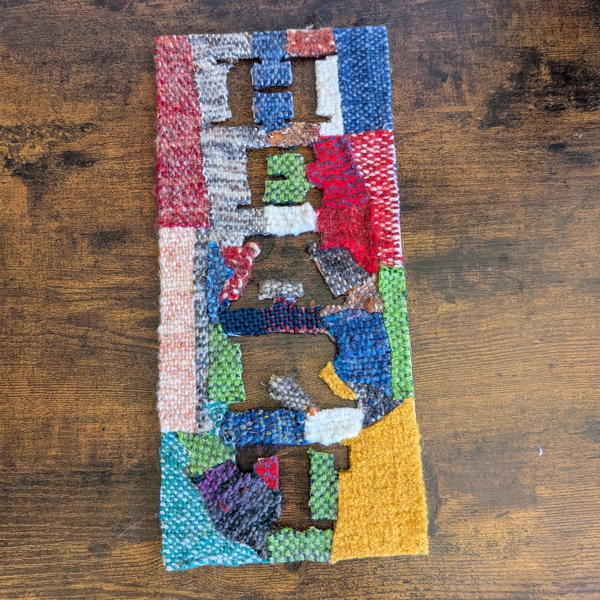 Celebrate the scrapbooking of your heart when surrounded by found family with the scraps of handwoven felted wool fabric on a pine backing.