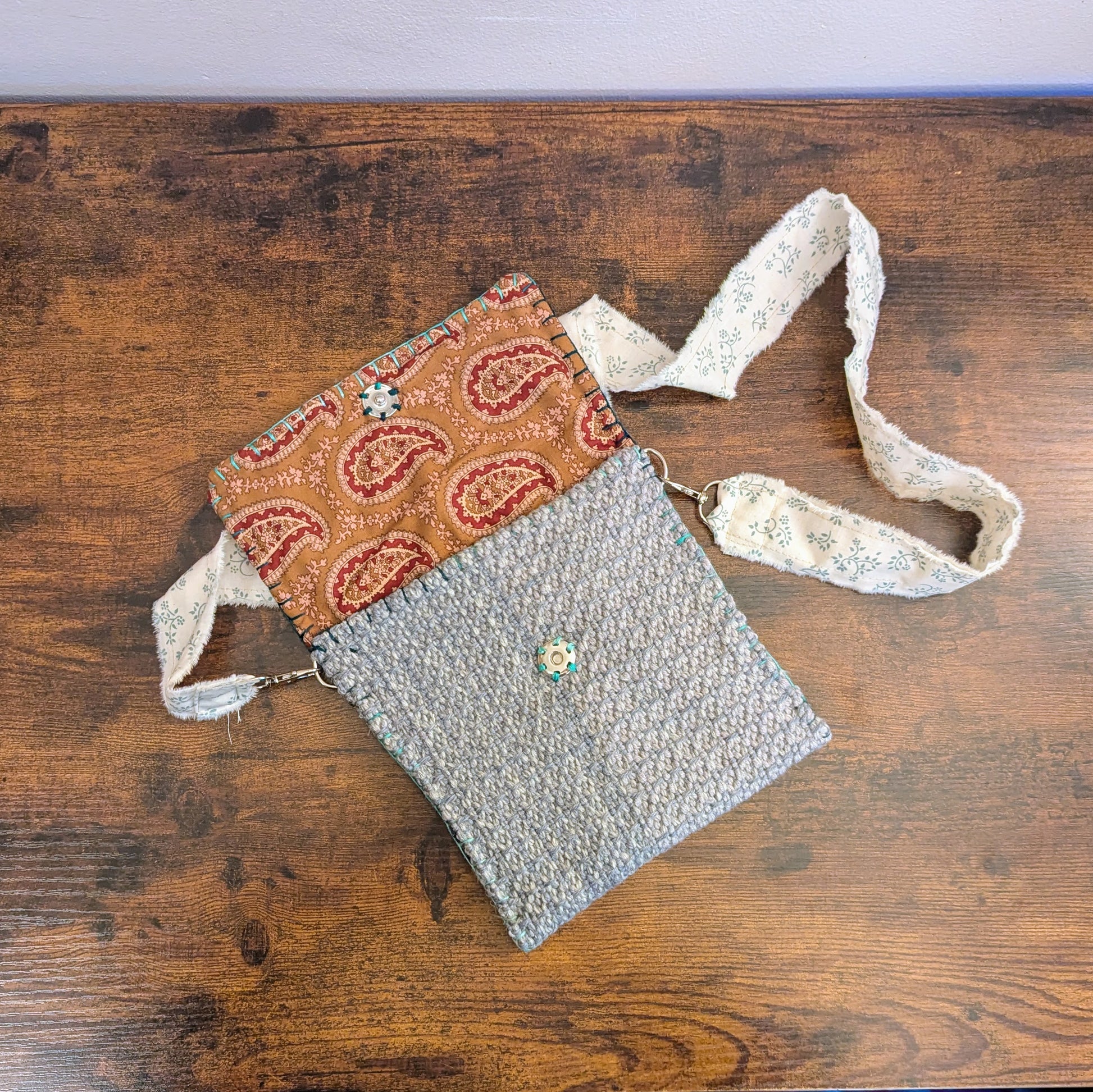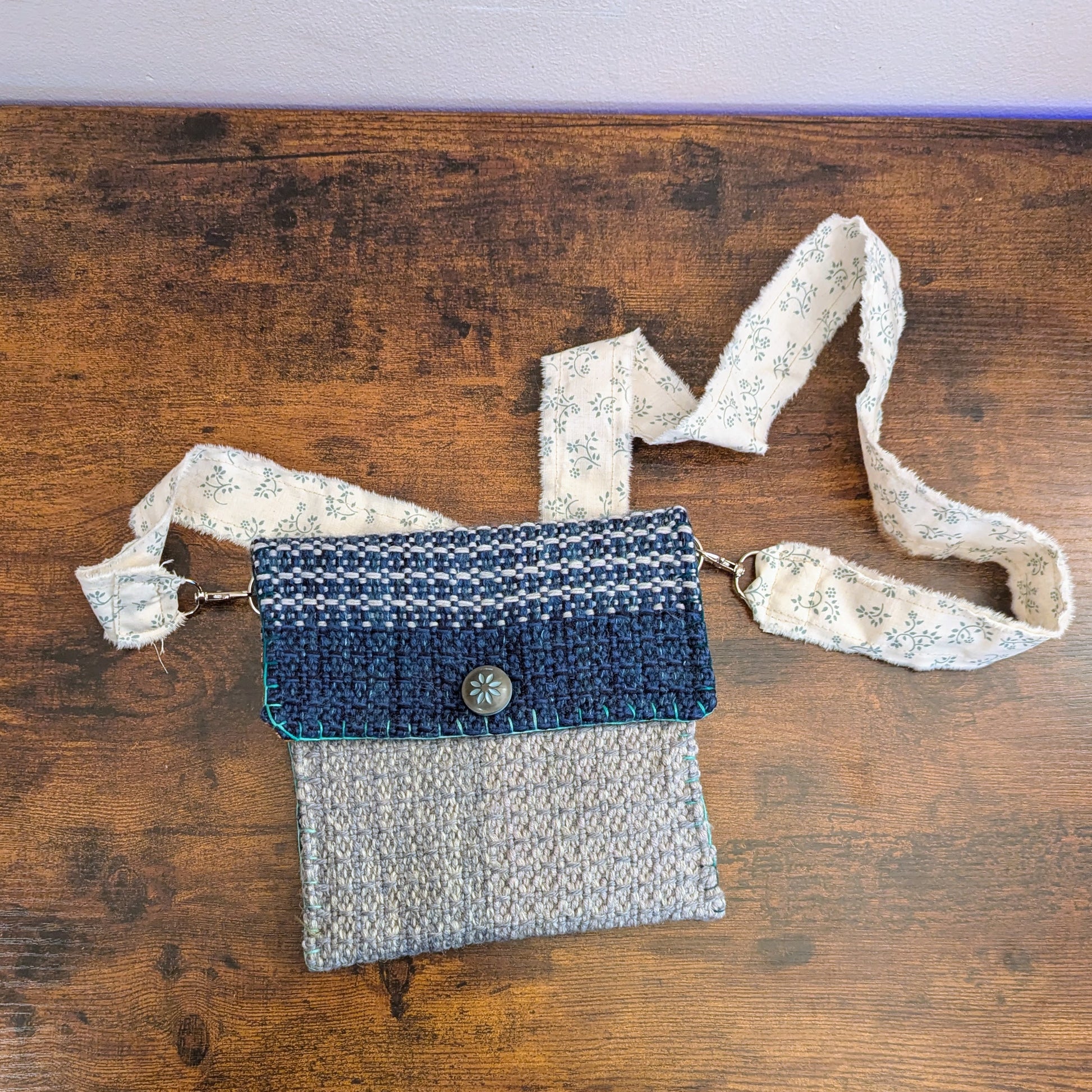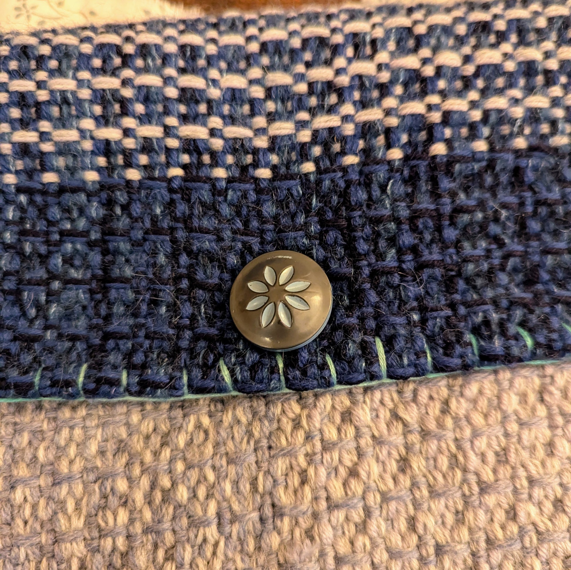 Warm secondhand Finnish wool in cool tones meets a snowflake element themed vintage button in this smaller handwoven handbag.