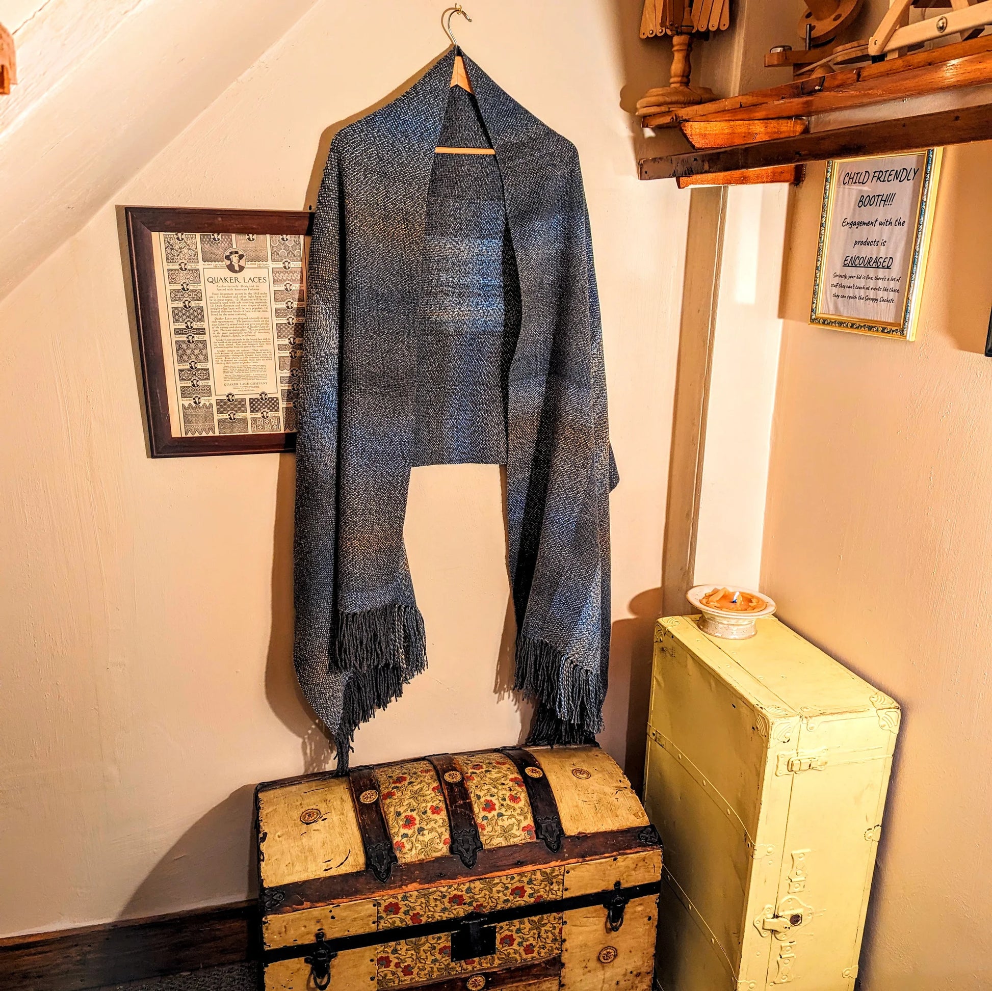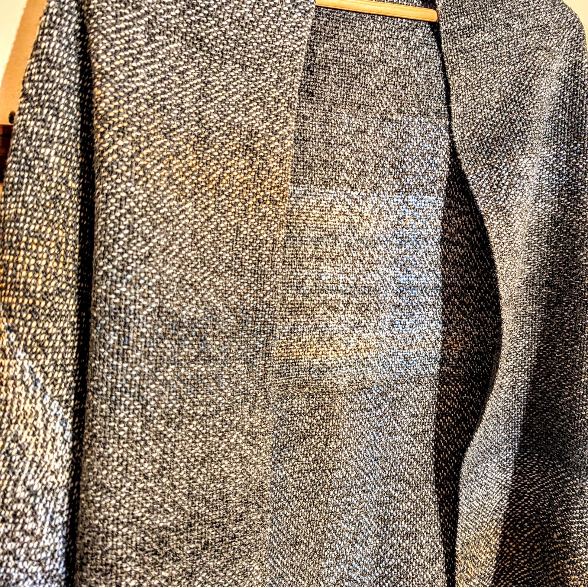 Smokey blues, tweed greys, and all in an incredibly soft supple woven shawl, wrap yourself in the comforts of a winter storm.