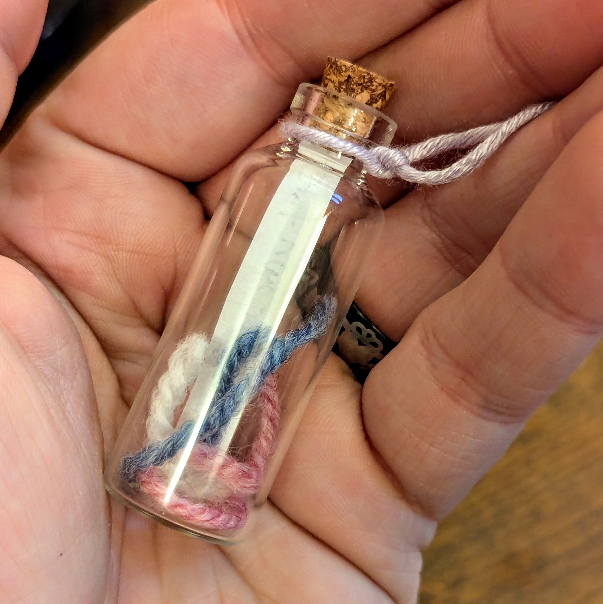 Show your genderqueer pride and support with these glass vial ornaments with trans flag colored scraps of yarn, a handwritten "Weave Your Own Fate" note from the transmasc agender weaver, carefully secured corks, and blue and purple bamboo acrylic string.