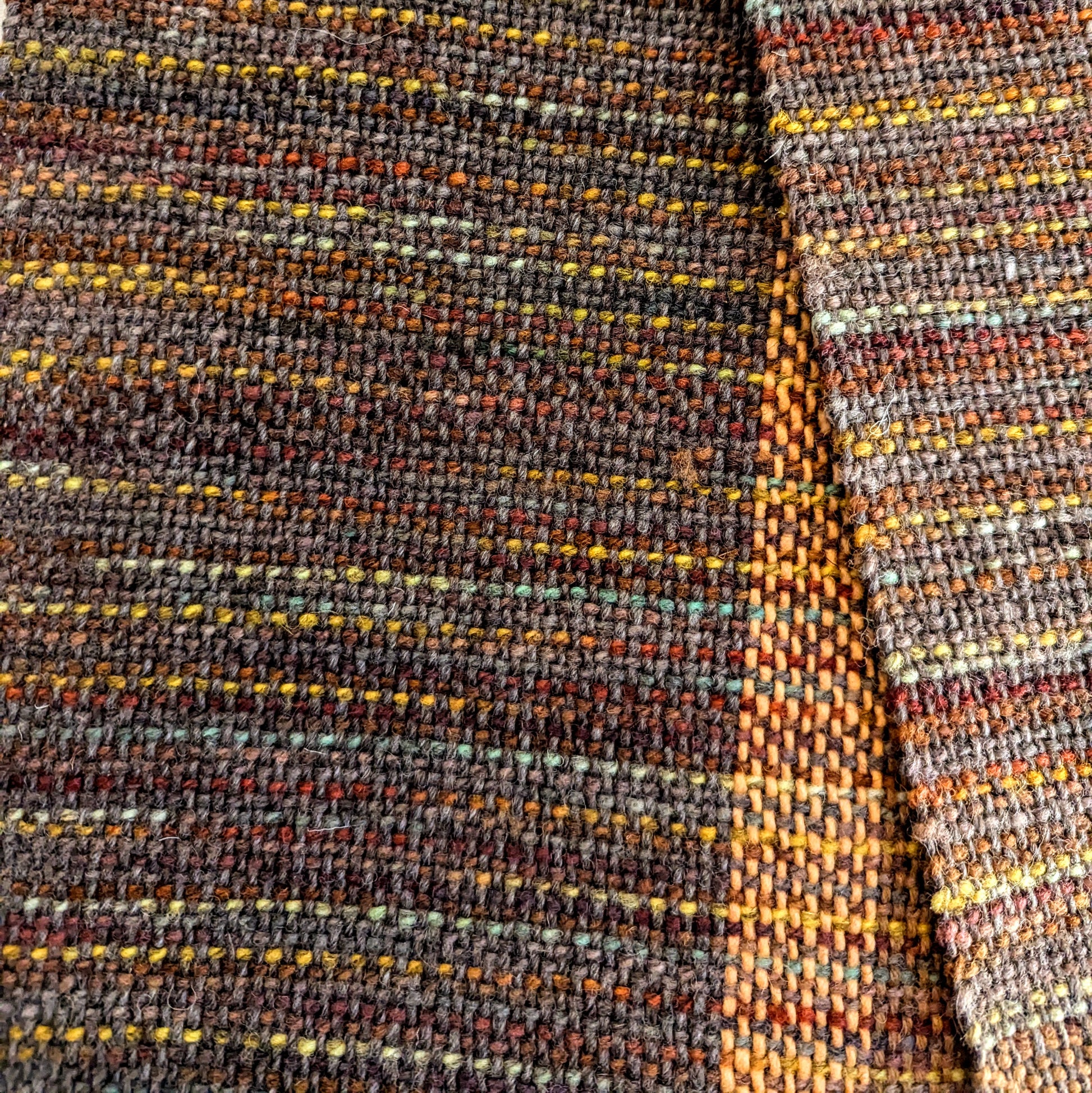 Deep browns with flecks of sky blue, maroon and purple in a medley of wool and cotton.