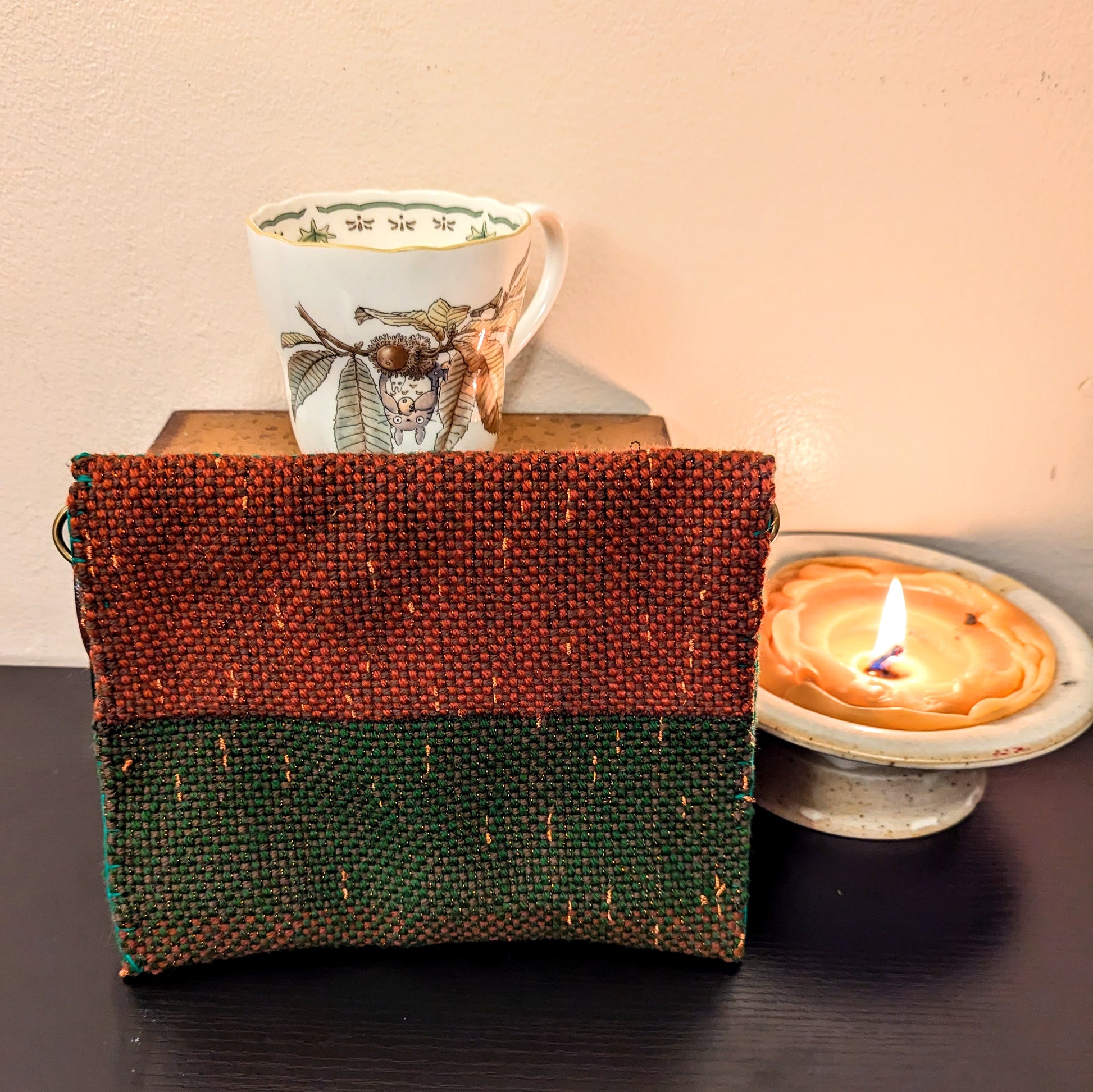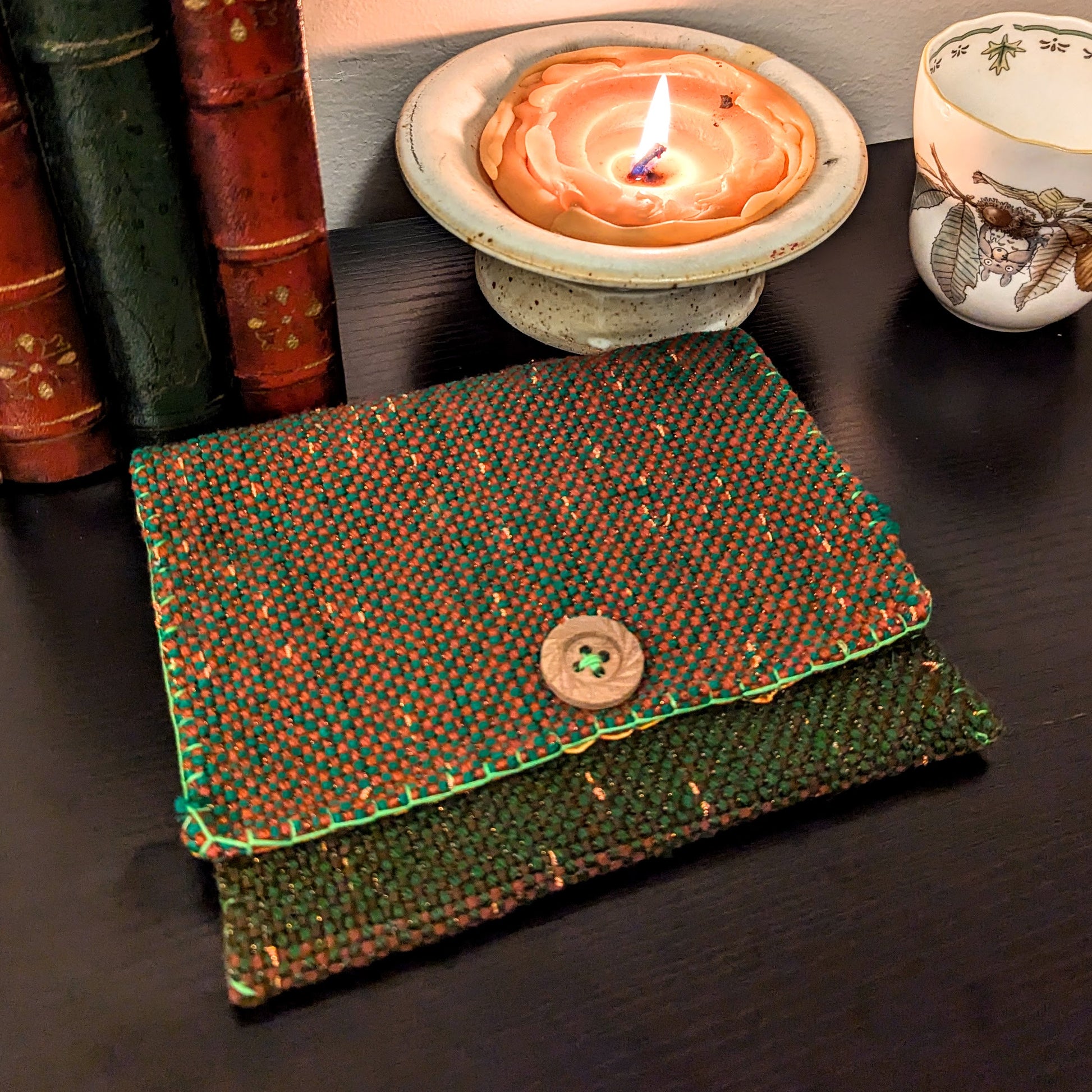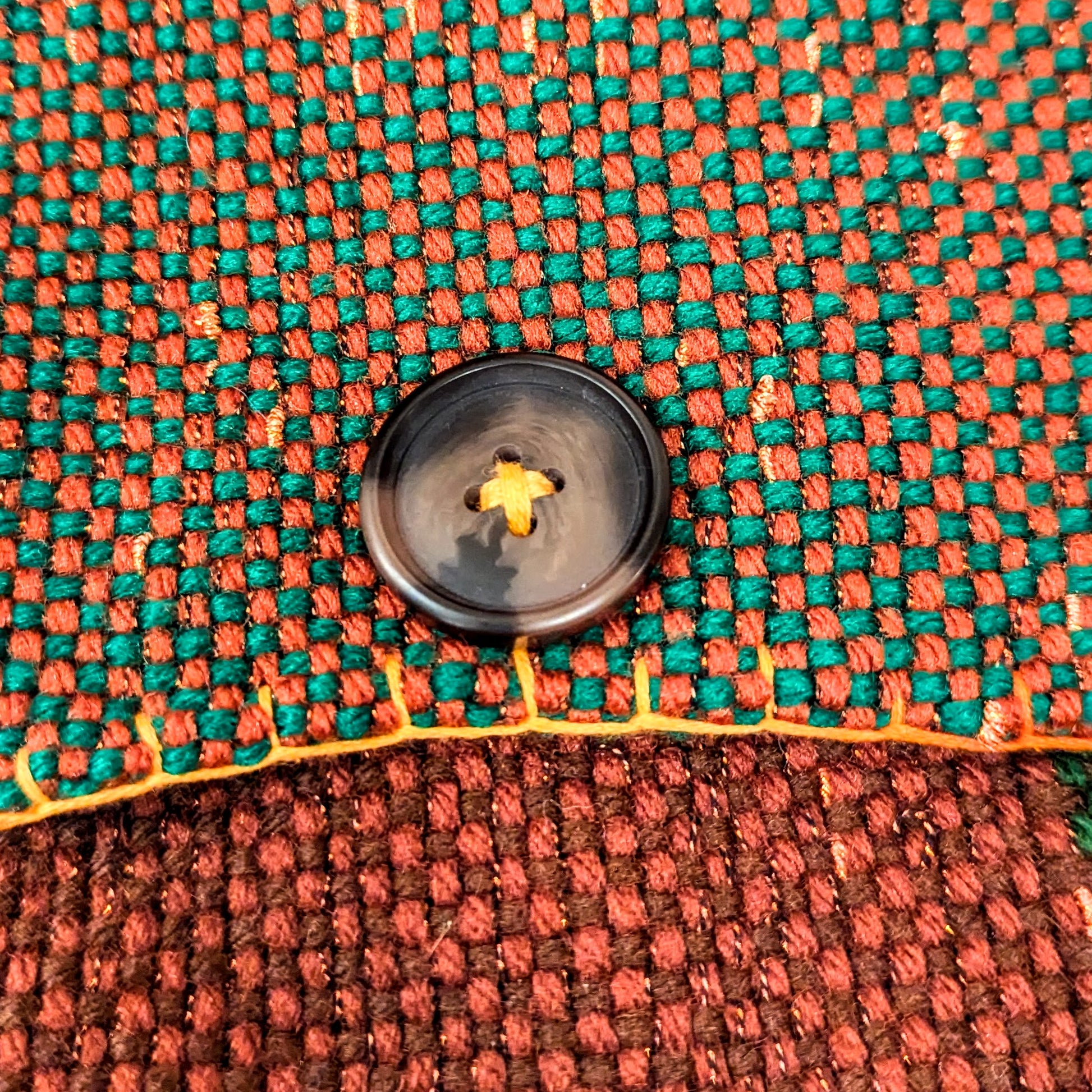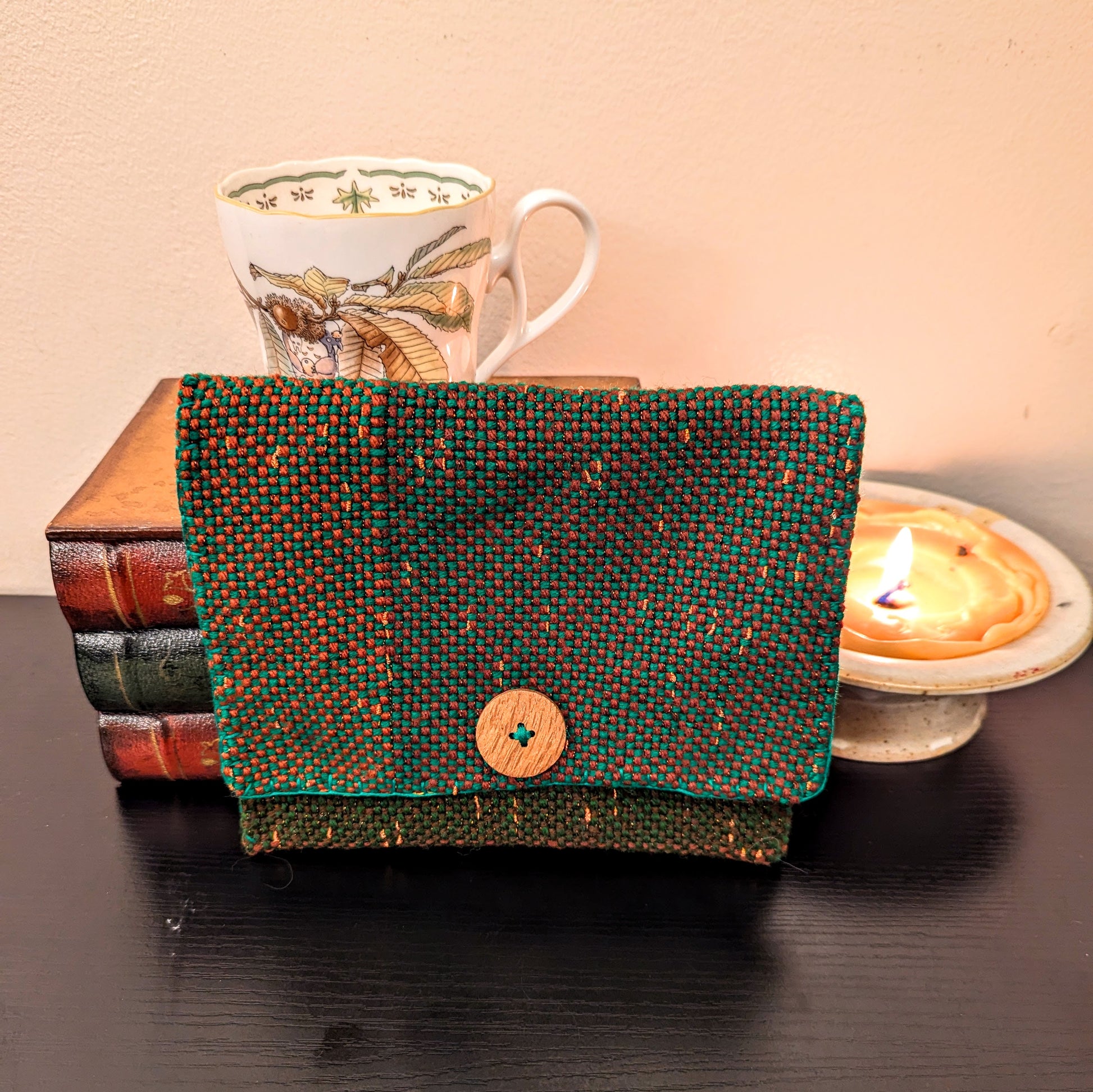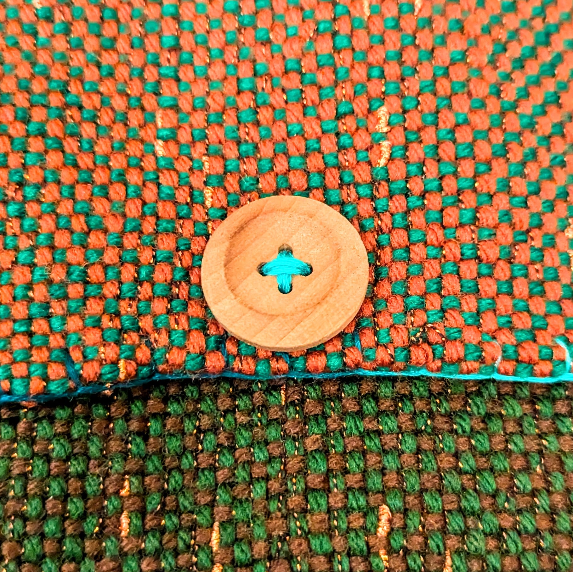 Forest Green, burnt umbers, ochres and flecks of bright copper handwoven fabrics, lined with a harvest motif muslin, with an assortment of wooden and vintage buttons and metal snaps will keep your e-reader safe and secure as you relax into pleasant reading, now with attachment points for a strap of your choosing taking you into adventure!